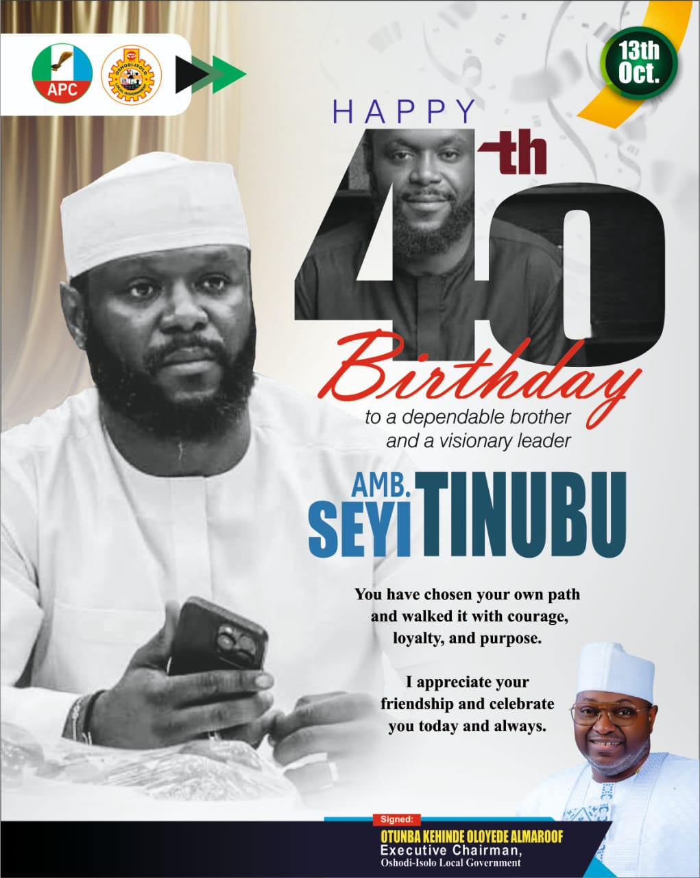 The Executive Chairman of Oshodi-Isolo Local Government, Otunba Kehinde Almaroof-Oloyede, popularly called Kendoo, has extended heartfelt felicitations to Ambassador Seyi Tinubu, the distinguished son of the President of the Federal Republic of Nigeria, His Excellency Asiwaju Bola Ahmed Tinubu, GCFR, as he gracefully marks his 40th birthday.
